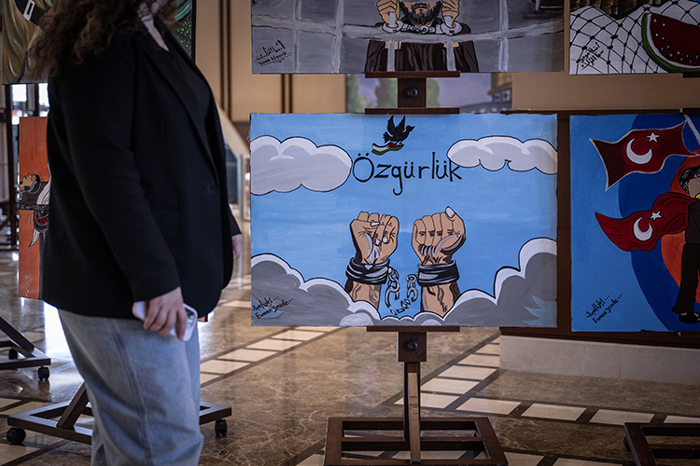 Çankaya Halk Eğitim Merkezi yaz okulu çalışmalarına katılan Filistinli öğrencilerin yağlı boya ve akrilik teknikle hazırladığı 101 eserden oluşan sergide, Gazzeli gençlerin ortaya koyduğu çalışmalar yer aldı.