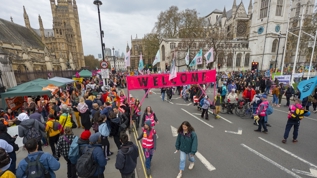 "İklim değişikliği değil, sistem değişikliği", "Çocuklarımızın geleceğini kurtarın, "Fosil yakıtlara son" yazılı pankartlar taşıyan göstericiler, İngiliz hükümetine iklim kriziyle mücadelede daha fazla çalışma yürütmesi çağrısında bulundu.