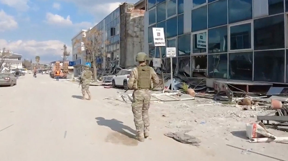 Bakanlığın paylaştığı görüntülerde, Mehmetçiğin, Hatay'ın cadde ve sokaklarında, yıkılan binaların civarında, iş merkezlerinin bulunduğu bölgede devriye faaliyetinde olduğu görülüyor.