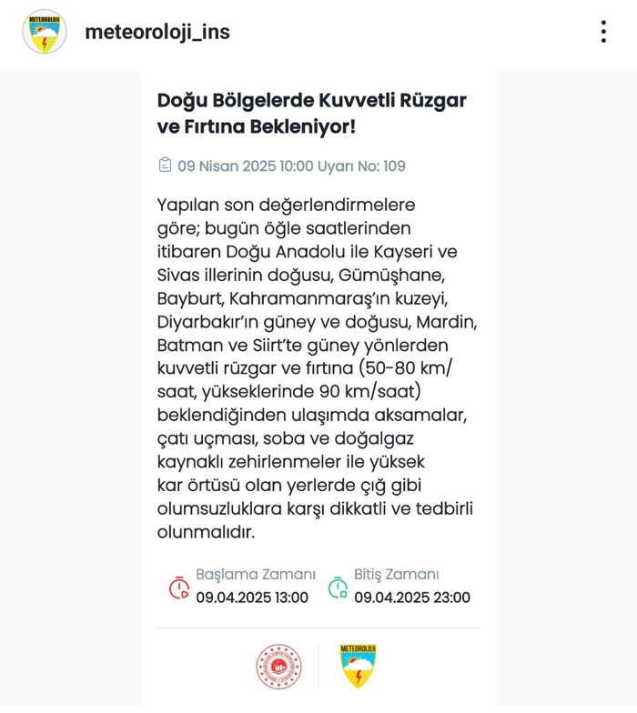 KUVVETLİ RÜZGAR UYARISI: Rüzgârın, Doğu Karadeniz'in iç kesimleri ile Doğu ve Güneydoğu Anadolu'nun doğusunda kuvvetli ve kısa süreli fırtına (40-70 km/saat) şeklinde esmesi beklendiğinden yaşanabilecek olumsuzluklara karşı dikkatli ve tedbirli olunması gerekmektedir.