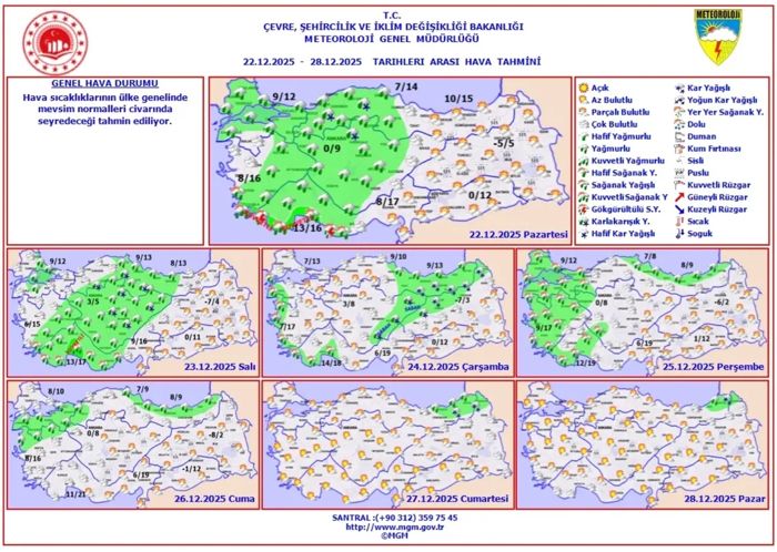 22 Aralık 2025 hava durumu haberi... Meteoroloji Genel Müdürlüğü günlük hava durumu tahminlerini paylaştı. Meteoroloji verilerine göre, bugün Türkiye genelinde parçalı, yer yer çok bulutlu, Güney ve İç Ege, Batı Akdeniz, İç Anadolu, Batı ve Orta Karadeniz ile İstanbul, Kocaeli, Sakarya, Bilecik, Kırklareli'nin kıyı kesimleri ve Balıkesir'in kuzey kesimlerinin aralıklı yağışlı geçeceği tahmin ediliyor.