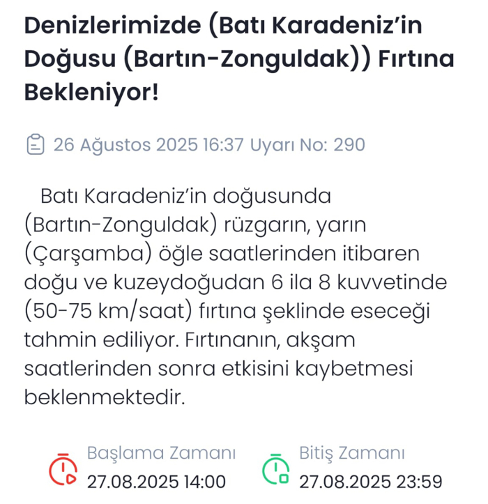 Hava Durumu: Parçalı ve az bulutlu, doğusu yer yer çok bulutlu Doğu Karadeniz'in doğusu sağanak ve gök gürültülü sağanak yağışlı, Rüzgar: Batı Karadeniz'de doğu ve kuzeydoğudan 5 ila 7, öğle ve akşam saatlerinde doğusu 8; Doğu Karadeniz'de doğu ve kuzeydoğudan, akşam saatlerinden itibaren kuzeybatıdan, doğusu güneybatıdan 3 ila 5, öğle saatlerinde batısı doğudan 6 kuvvetinde, Dalga: 1,0 ila 2,0 m, batısı yer yer 3,0 m, öğle ve akşam saatlerinde Batı Karadeniz'in doğusu 3,5 m; Görüş: İyi, yağış anında orta.