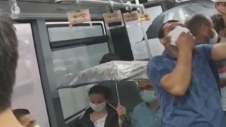 Görüntülerde koltukta oturan bir çift ile ayakta yolculuk eden bir başka yolcunun şemsiye açtığı görülüyor.