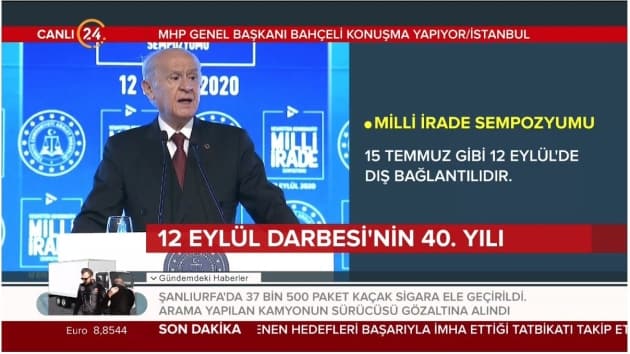 Demokrasi ve Özgürlükler Adası'nda 12 Eylül askeri darbesinin 40. yılı nedeniyle 'Vesayetten Demokrasiye Milli İrade Sempozyumu' düzenleniyor. Sempozyuma Cumhurbaşkanı Recep Tayyip Erdoğan'ın yanı sıra TBMM Başkanı Mustafa Şentop, MHP Genel Başkanı Devlet Bahçeli de katıldı. MHP lideri Bahçeli, sempozyum kapsamında konuşma yapıyor. Bahçeli "12 eylül zulümdür, zillettir, hezimettir, rezalettir, cinayettir" dedi.