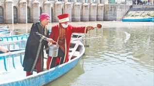 Konya'nın Beyşehir ilçesinde, yakın gelecekte kuruyarak yok olmasından endişe edilen Beyşehir Gölü'ne temsili Nasreddin Hoca maya çaldı.