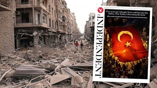 Bugünkü manşetinde muhabiri Patrick Cockburn “5 yıl önce Suriye Türkiye'ye benzeyebilir diye düşünüyordum. Şimdi ise Türkiye Suriye gibi oluyor" şeklindeki düşüncelerini manşete taşıyan Independent, Türkiye'de karışıklık varmış algısı yaratma çabalarını sürdürüyor.