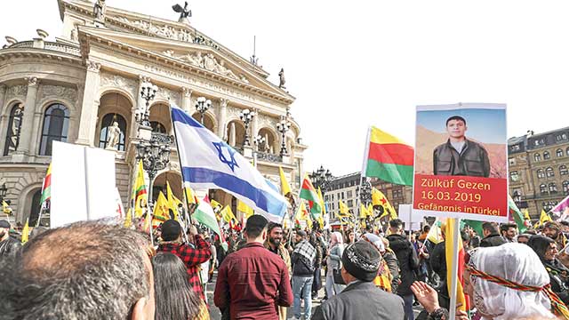 Almanya’daki PKK/YPG yandaşları, ‘Nevruz kutlaması’ adı altında önceki gün Frankfurt kentinde yürüyüş ve gösteri düzenledi. Ülkenin çeşitli şehirlerinden Frankfurt’a gelen PKK’lılar, örgüt paçavralarını ve teröristlerin fotoğraflarını taşıdı, Türkiye aleyhine sloganlar attı. Sözde kutlama, PKK elebaşı Öcalan ve terör hükümlüsü Selahattin Demirtaş’a destek gösterisine dönüştü. Örgüt yandaşları gösteride, İsrail bayrakları da açtı. Böylece, PKK-İsrail ilişkisi bir kez daha gözler önünü serilmiş oldu.