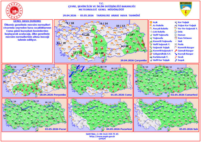 Meteoroloji Genel Müdürlüğü (MGM) tarafından yapılan son değerlendirmelere göre: Ülkemizin güney, iç ve doğu kesimlerinin parçalı yer yer çok bulutlu, Akdeniz'in iç kesimleri, Doğu Anadolu'nun doğusu ile Afyonkarahisar, Ankara'nın kuzey ilçeleri, Konya, Bingöl, Mardin, Batman ve Siirt çevrelerinin sağanak ve gök gürültülü sağanak yağışlı geçeceği tahmin ediliyor. Sabah ve gece saatlerinde Marmara'nın doğusu ile Karadeniz'in iç kesimlerinde pus ve yer yer sis bekleniyor. Doğu Karadeniz'in iç kesimleri ile Doğu Anadolu'da yüksek kar örtüsüne sahip eğimli alanlarda çığ ve kar erimesi tehlikesi bulunmaktadır.