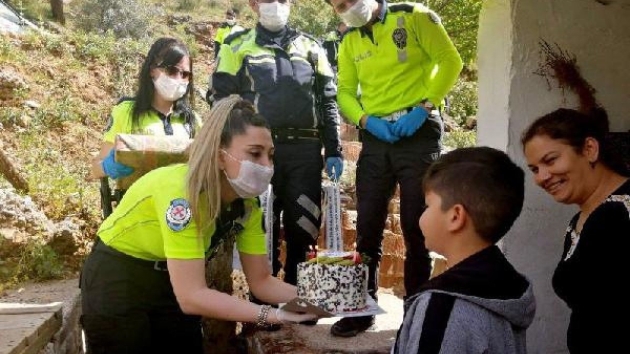 Ardından evin önüne gelip, getirdikleri pastayı uzatan ekipler, Yiğit Çalış'ın doğum gününü kutladı. Muğla Trafik Şube Müdürü Raşit Tosun tarafından gönderilen sürpriz hediye de küçük çocuğa verildi.