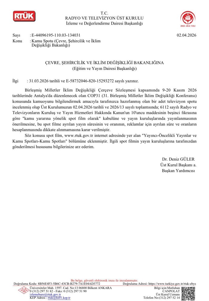 RTÜK, 2 Nisan 2026 tarihli toplantısında, COP31 için hazırlanan bu spotun kamu yararına hizmet verdiğine hükmetti ve yayın kuruluşlarına gönderilmesine karar verdi. Ayrıca, söz konusu kamu spotunun reklam süresi hesaplamalarına dahil edilmeyeceği belirtildi.