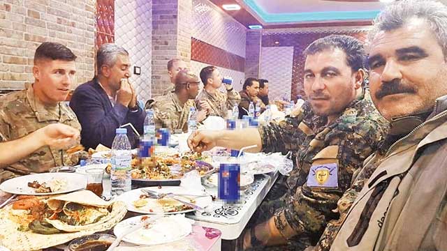 Suriye'de terör örgütü DEAŞ’la mücadele bahanesiyle bebek katili YPG/PYD'ye 5 binden fazla silah ve mühimmat desteği sağlayan, 500 milyon dolar bütçe ayıran ABD, teröristlere verdiği desteği bir kez daha gösterdi. ABD Gaziler Günü nedeniyle, terör örgütünün işgali altında bulunan Münbiç kentinde, ABD'li komutan ve askerlerin katıldığı bir yemek organizasyonu tertip edildi. PKK'nın Suriye kolu YPG'nin ana omurgasının oluşturduğu SDG ve sözde Münbiç Askeri Konseyi, ABD'nin Gaziler Günü'nü birlikte kutladı. Fotoğraflarda PKK’lılarla ABD’lilerin aynı masada yemek yediği görülüyor. Bu görüntülerle ABD'nin kime destek verdiği bir kez daha belgelenmiş oldu. Suriye PKK'sının elebaşlarından Şervan Derviş ve terör örgütüne yakın gazeteciler, verilen yemeğin fotoğraflarını sosyal medyadan paylaştı. Ayrıca terör örgütü SDG Münbiç Askeri Konseyi, ABD Gaziler Günü’ne ilişkin bir de yazılı açıklama yayımladı.