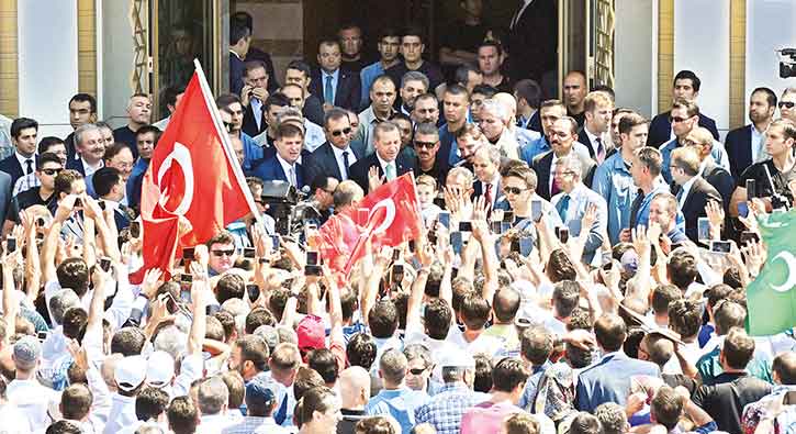 Cumhurbaşkanı Erdoğan, Türkiye’nin, 81 il ve 79 milyon vatandaşıyla 15 Temmuz’da yaşadığı, tarihinin en hain, en alçak silahlı darbe girişimine karşı direnişini kararlı bir şekilde sürdürdüğünü vurguladı. Devletin tamamen duruma hakim olduğunu ve Fetullahçı Terör Örgütü mensuplarının kurumlardan temizleme sürecinin hızla sürdüğüne vurgu yapan Erdoğan, “Feraseti ve cesaretiyle silahlı darbe girişimini akamete uğratan kahraman milletimden, ülkemiz bu sıkıntılı dönemden tamamen çıkana kadar meydanlarda tuttuğu demokrasi nöbetini sürdürmesini rica ediyorum” çağrısında bulundu. Gelecek nesillerin, siviliyle, polisiyle, askeriyle 15 Temmuz demokrasi direnişinin tüm kahramanlarını asla unutmayacaklarını vurgulayan Erdoğan, “15 Temmuz tarihini her yıl şehitlerimizi anma günü olarak ilan ettiğimizi de bu vesileyle sizlerle paylaşmak istiyorum. Türk milleti, tarih yapan ve yazan bir millet olduğunu bir kez daha ortaya koymuştur” dedi.