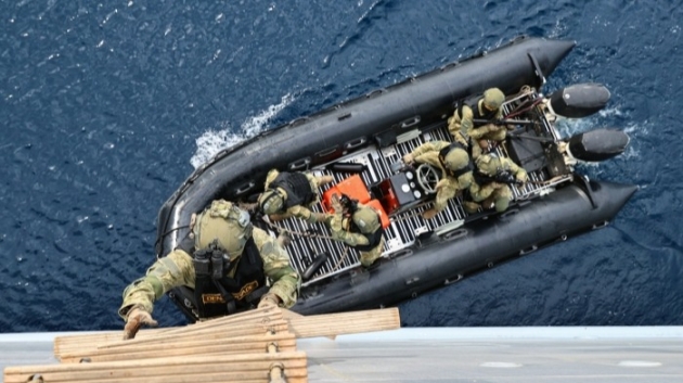 "Timsahlar", bu gemilerdeki eğitimlerde senaryo gereği teröristler tarafından kaçırılan gemiye çıkma harekatını gerçekleştiriyor.
