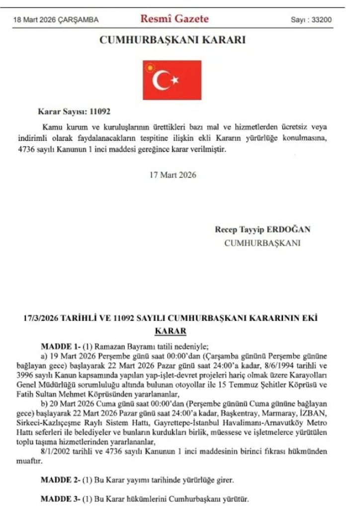 Buna göre, bayram tatili nedeniyle KGM sorumluluğu altında bulunan otoyollar ile 15 Temmuz Şehitler ve Fatih Sultan Mehmet köprülerinden geçişler, bu gece saat 00.00'dan başlayarak 22 Mart Pazar gün sonuna kadar ücretsiz olacak.