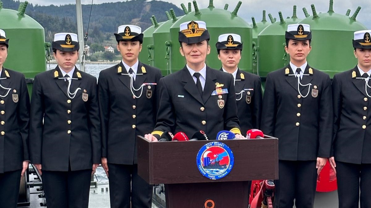 Türk Silahlı Kuvvetlerinin ilk kadın amirali Deniz Kuvvetleri Komutanlığı Savunma Planlama ve Proje Yönetimi Başkanı Tuğamiral Gökçen Fırat, 8 Mart Dünya Kadınlar Günü'nde Milli Savunma Üniversitesi Deniz Harp Okulu öğrencileriyle "TCG Nusret"te bir araya geldi.