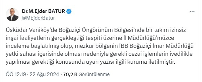 İstanbul Çevre, Şehircilik ve İklim Değişikliği İl Müdürü Maliki Ejder Batur, Vaniköy'de Boğaziçi Öngörünüm Bölgesi'ndeki izinsiz inşaat faaliyetlerine ilişkin gerekli cezai işlemlerin yapılması konusunda İstanbul Büyükşehir Belediyesi (İBB) Boğaziçi İmar Müdürlüğüne uyarı yazısı iletildiğini bildirmişti.