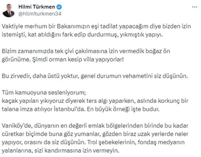 Geçmişte bir bakanın eşinin kaçak katını bile yıktırdığını hatırlayarak kamuoyuna seslenen Türkmen, "Kaçak yapıları yıkıyoruz diyerek ters algı yaparken, aslında korkunç bir talana imza atılıyor İstanbul'da. En büyük örneği işte budur. Vaniköy'de, dünyanın en değerli emlak bölgelerinden birinde bu kadar cüretkar biçimde buna göz yumanlar, gözden biraz uzak yerlerde neler yapıyor, orasını da siz düşünün. Trol şebekelerinin, fondaş medyanın yalanlarına, sizi kandırmasına izin vermeyin" vurgusu yaptı.