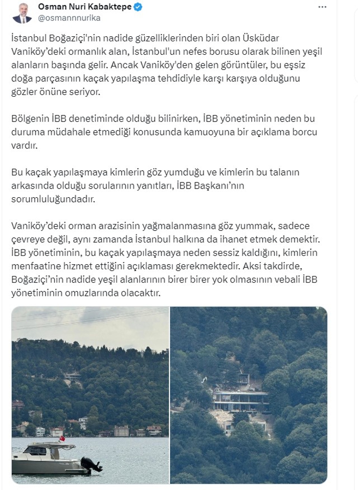 AK Parti İstanbul İl Başkanı Osman Nuri Kabaktepe, Üsküdar Vaniköy'de Boğaziçi Öngörünüm Bölgesi'ndeki izinsiz inşaata ilişkin, "Bu kaçak yapılaşmaya kimlerin göz yumduğu ve kimlerin bu talanın arkasında olduğu sorularının yanıtları, İBB Başkanının sorumluluğundadır. Vaniköy'deki orman arazisinin yağmalanmasına göz yummak, sadece çevreye değil, aynı zamanda İstanbul halkına da ihanet etmek demektir." dedi.