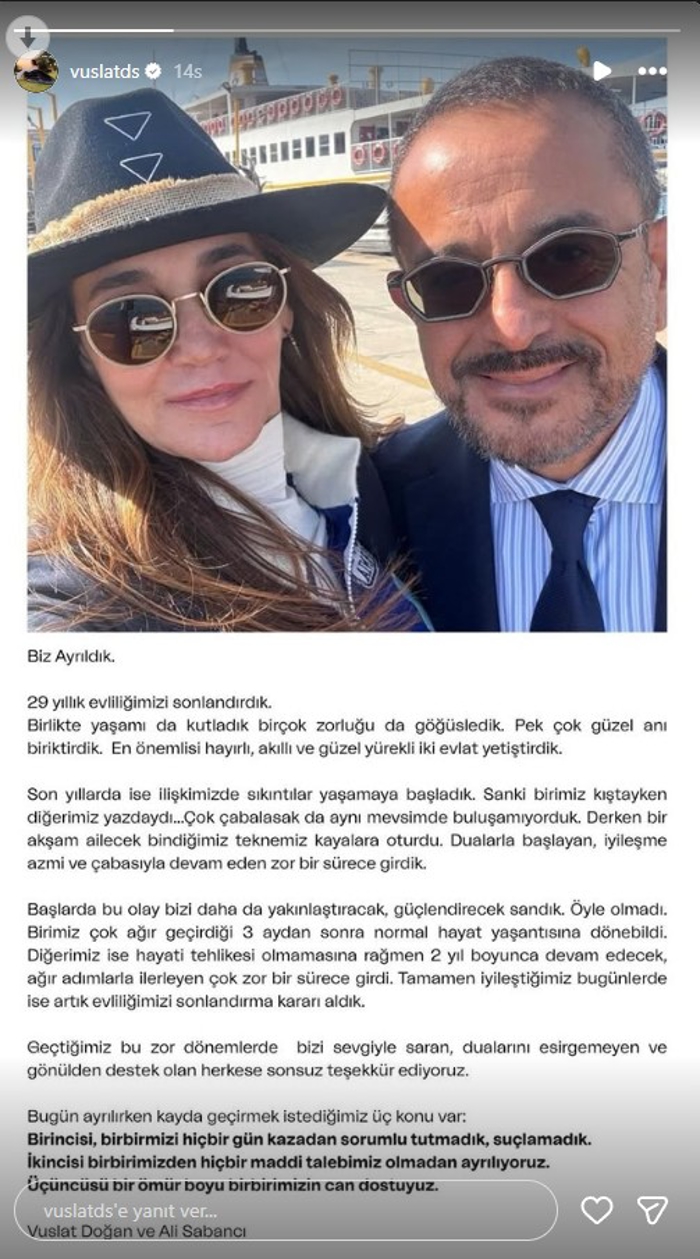 29 yıllık evliliklerini bitirecek olan Sabancı ve Doğan, yaptıkları ortak açıklamada şu ifadeleri kullandı: