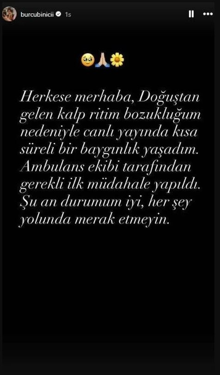 "Herkese merhaba, doğuştan gelen kalp ritim bozukluğum nedeniyle canlı yayında kısa süreli baygınlık yaşadım. Ambulans ekibi tarafından gerekli ilk müdahale yapıldı. Şuan durumum iyi, her şey yolunda merak etmeyin"