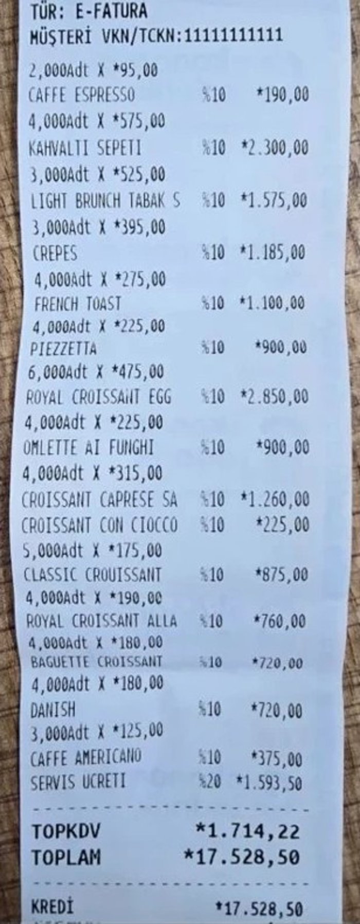 Yayınlanan listede bazı ürünlerin fiyatları dikkat çekti. Menüde Americano'nun 125 lira, espresso'nun 95 lira, klasik kruvasanın 175 lira, omletin 225 lira olduğu görülürken kahvaltı sepetinin 575 lira, brunch tabağının ise 525 lira olması dikkat çekti