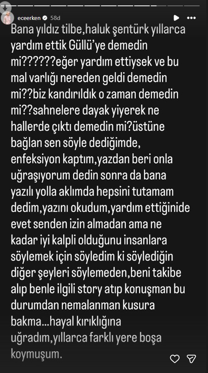 "Bir yanlış anlaşılmayı düzeltmek istiyorum. Bir röportajda 'Güllü'nün çıkma katta yaşadığının farkında mısınız?' dedim. Güllü'nün bir arkadaşı yayına bağlandı ve 'Bütün apartman Güllü'nün sen nereden biliyorsun?' dedi. Ben de onun üzerine Ece'yi arayıp durumu anlattım.