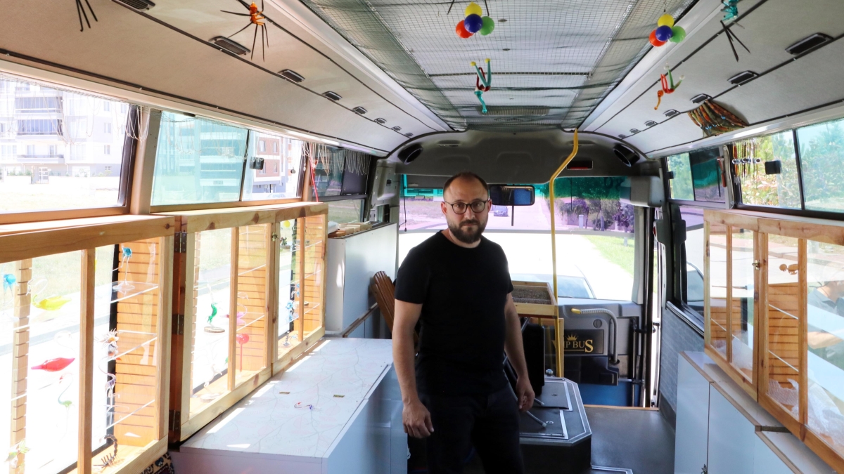 Eskişehir'de, cam ustası Yasin Yüksel (37) ile ebru sanatçısı olan anaokulu öğretmeni eşi Meryem Yüksel (36), 70 bin liraya satın aldıkları otobüsü 100 bin lira masrafla konforlu 'sanat atölyesi'ne çevirdi.