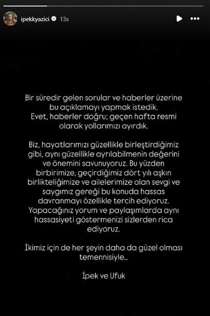 Oyuncu İpek Filiz Yazıcı ile şarkıcı Ufuk Beydemir 2022 yılında nikah masasına oturmuştu. Evliliklerini magazinden uzak bir şekilde sürdüren çift hakkında bir süredir, boşandıkları yönünde haberler çıkmıştı. O iddialar doğru çıktı. Ortak bir açıklama yapan Beydemir ve Yazıcı, ayrılığı şu sözlerle duyurdular: