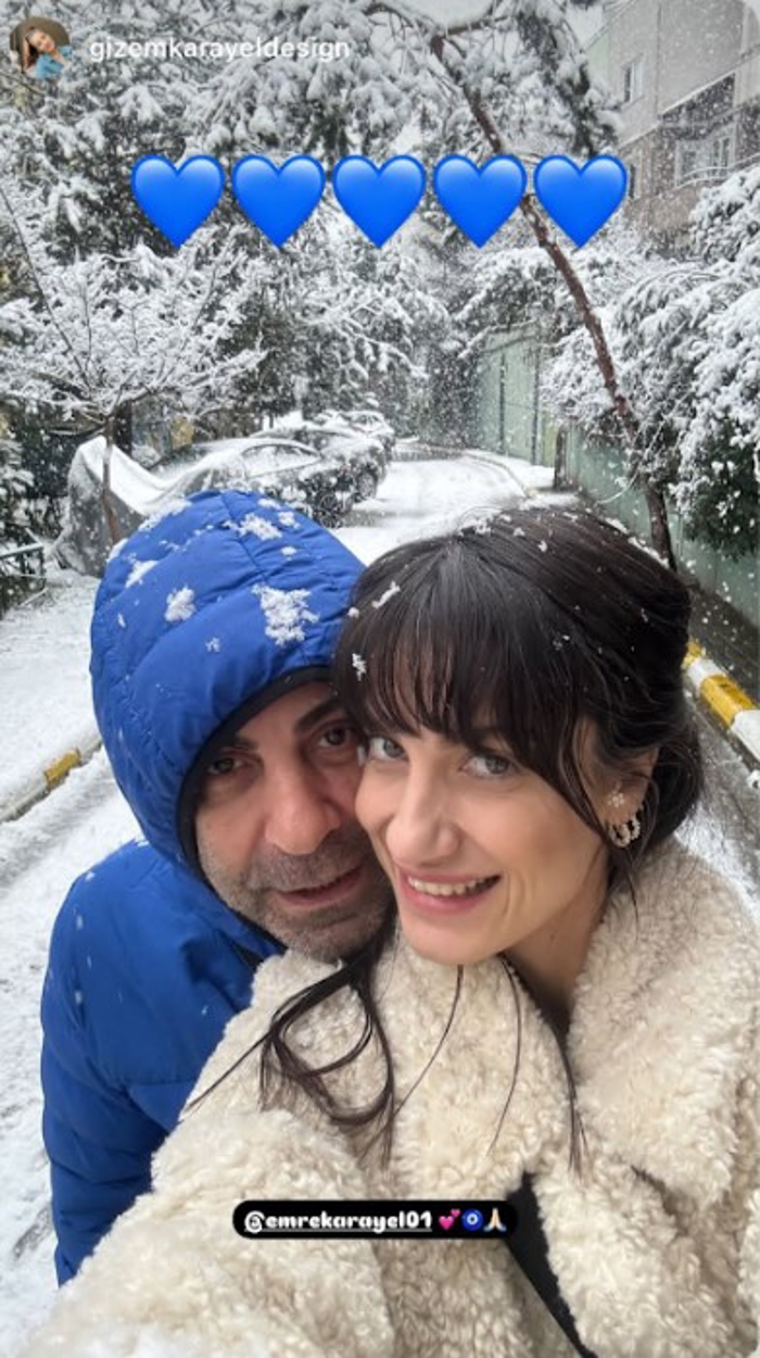 Emre Karayel, eşi Gizem Karayel ile birlikte kar yağışı eşliğinde romantik bir poz vererek, bu anı takipçileriyle paylaştı.