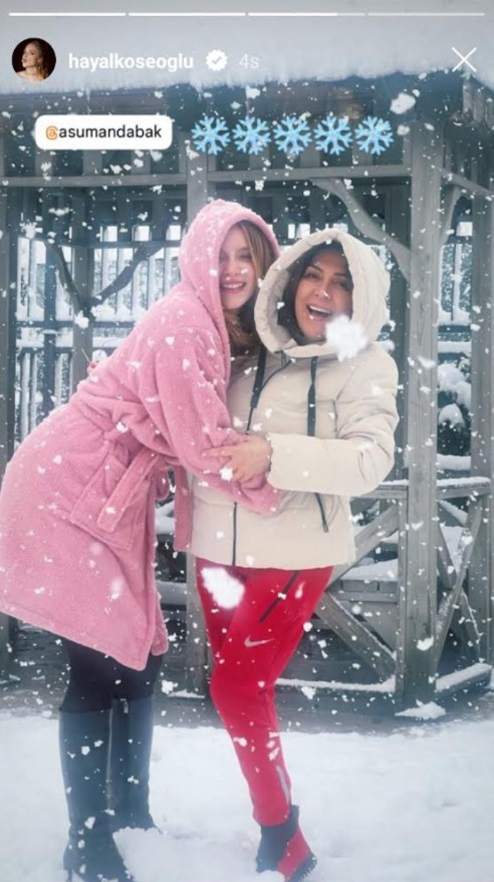 Güzel oyuncu Hayal Köseoğlu ise, Asuman Dabak ile gerçekleştirdiği çekim arasında karın tadını çıkardığı anları takipçileriyle paylaştı.