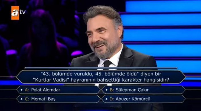 Yayınlanan yeni bölümde Kaynarca'ya bir sürpriz yapıldı. "43. bölümde vuruldu, 45. bölümde öldü" diyen bir Kurtlar Vadisi hayranının bahsettiği karakter kimdir?" sorusu, ünlü aktörü gülümsetti. Kaynarca, "Bir nostalji sorusu olmuş. Keyifliydi" ifadelerini kullandı.