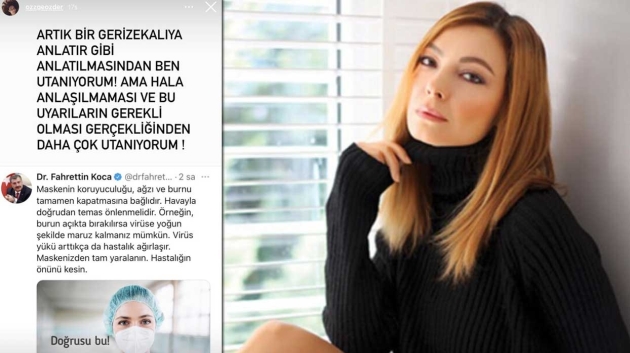 Sadakatsiz dizisinde Derya karakterini canlandıran Özge Özder, Sağlık Bakanı Fahrettin Koca'nın doğru maske kullanımıyla ilgili yaptığı paylaşımı yayımlayarak maske takmayanlara sert çıktı.
