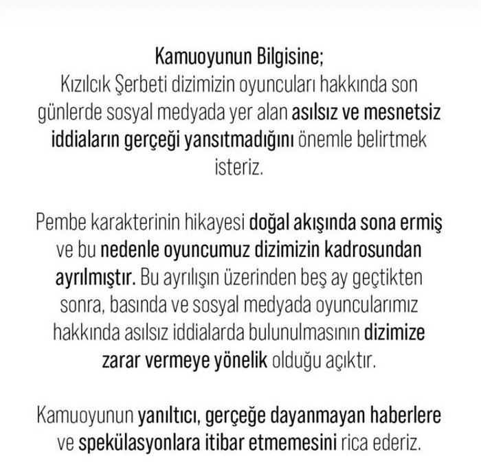 "Kamuoyunun bilgisine; 'Kızılcık Şerbeti' dizimizin oyuncuları hakkında son günlerde sosyal medyada yer alan asılsız ve mesnetsiz iddiaların gerçeği yansıtmadığını önemle belirtmek isteriz. 'Pembe' karakterinin hikayesi doğal akışında sona ermiş ve bu nedenle oyuncumuz dizimizin kadrosundan ayrılmıştır. Bu ayrılışın üzerinden beş ay geçtikten sonra, basında ve sosyal medyada oyuncularımız hakkında asılsız iddialarda bulunulmasının dizimize zarar vermeye yönelik olduğu açıktır. Kamuoyunun yanıltıcı, gerçeğe dayanmayan haberlere ve spekülasyonlara itibar etmemesini rica ederiz"