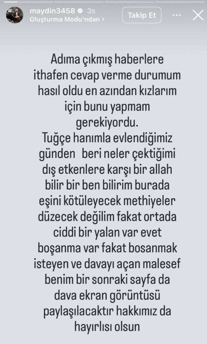 "Adıma çıkmış haberlere ithafen cevap verme durumum hasıl oldu. En azından kızlarım için bunu yapmam gerekiyordu. Tuğçe hanım ile evlendiğimiz günden beri neler çektiğimi, bir Allah bilir, bir ben bilirim. Burada eşini kötüleyecek methiyeler düzecek değilim fakat, ortada ciddi bir yalan var. Evet, boşanma var fakat boşanmak isteyen ve davayı açan maalesef benim. Bir sonraki sayfa da dava ekran görüntüsü paylaşılacaktır"