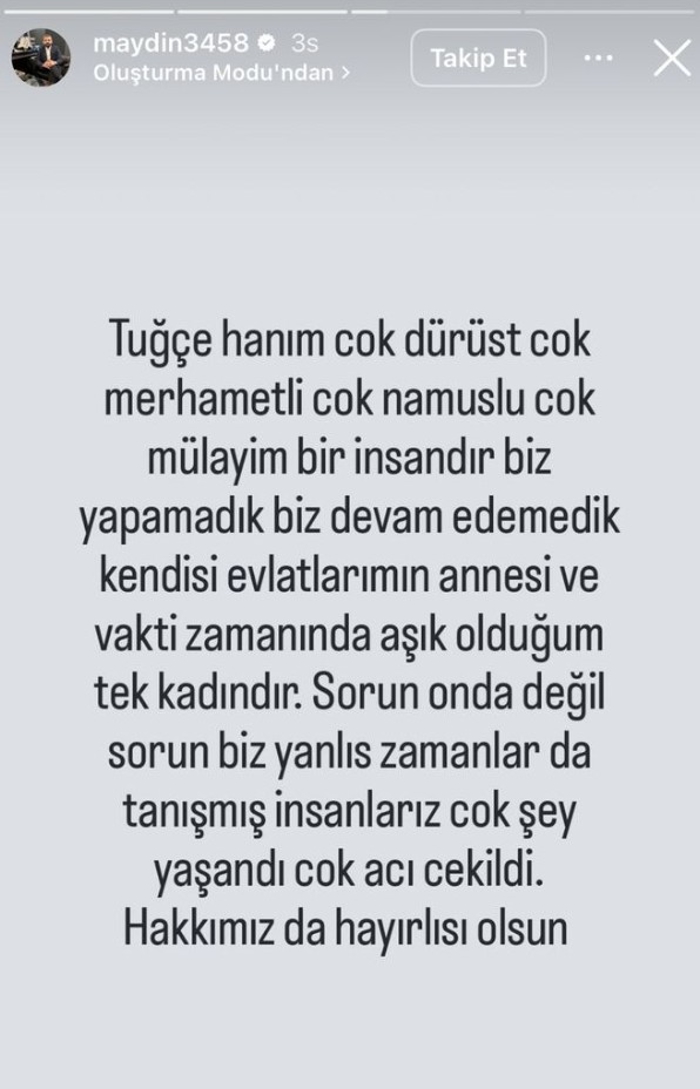 Daha sonra yeni bir paylaşımda daha bulunan Aydın, "Tuğçe hanım çok dürüst, çok merhametli, çok namuslu, çok mülayim bir insandır. Biz yapamadık, biz devam edemedik. Kendisi evlatlarımın annesi ve vakti zamanında aşık olduğum tek kadındır. Sorun onda değil, biz yanlış zamanlar da tanışmış insanlarız. Çok şey yaşandı, çok acı çekildi. Hakkımız da hayırlısı olsun" ifadelerine yer verdi.
