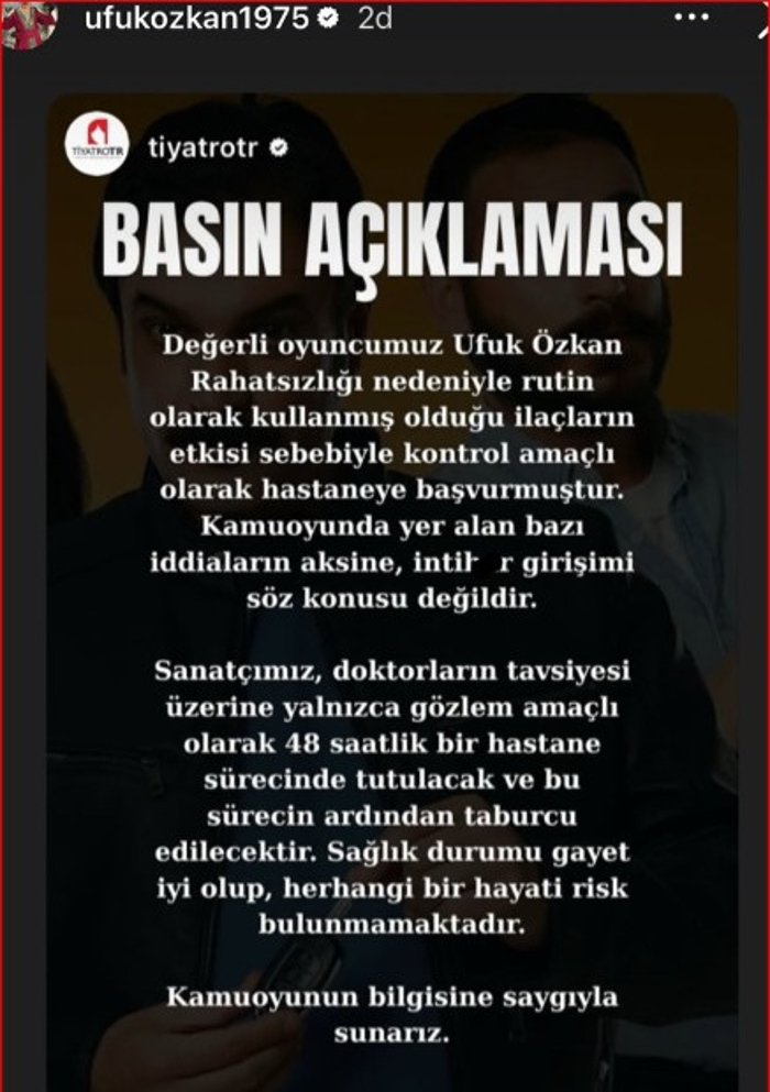 Ancak kısa süre sonra oyuncunun sosyal medya hesabından yeni bir açıklama yapıldı. Paylaşımda, "Rutin olarak kullanmış olduğu ilaçların etkisi sebebiyle, kontrol ve gözlem amaçlı olarak 48 saat boyunca hastanede tutulacak" ifadeleri yer aldı.
