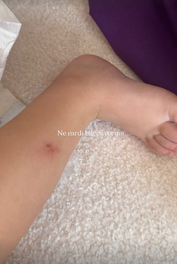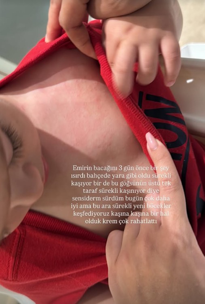 "Emir'in bacağını 3 gün önce bir şey ısırdı bahçede. Yara gibi oldu sürekli kaşınıyor. Bir de bu göğsünün üstü tek taraf sürekli kaşınıyor diye krem sürdüm. Bugün çok daha iyi ama bu ara sürekli yeni böcekler keşfediyoruz. Kaşına kaşına bir hal olduk, krem çok rahatlattı"