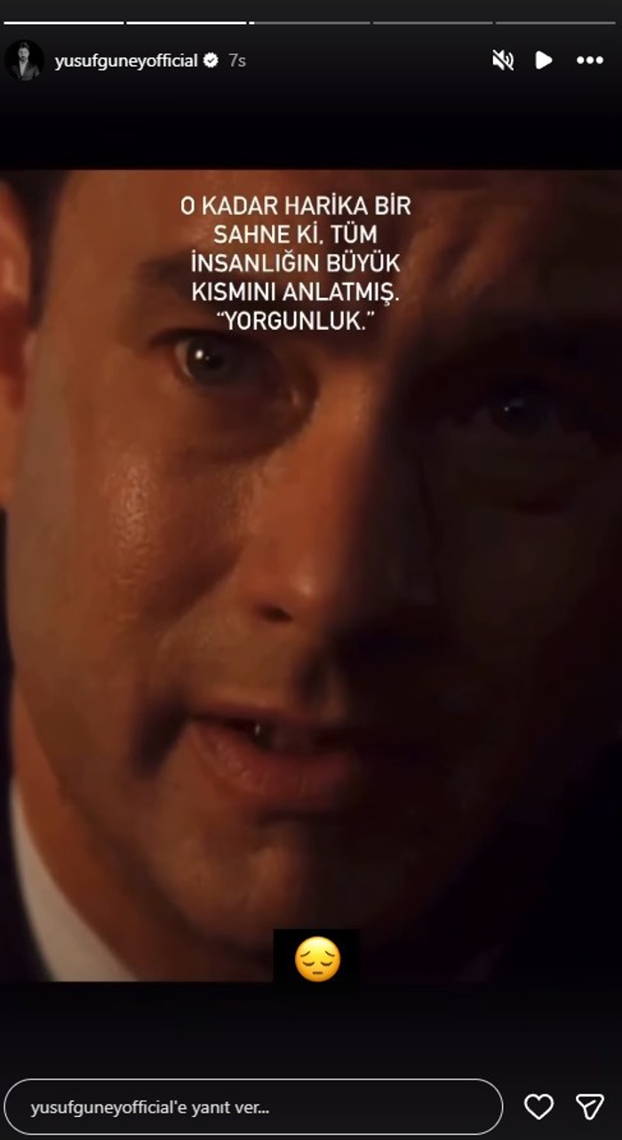 Yusuf Güney, yaşananların ardından Yeşil Yol filminden bir sahneyi "O kadar harika bir sahne ki, tüm insanlığın büyük kısmını anlatmış; Yorgunluk" notuyla sosyal medya hesabından takipçileri ile paylaştı.