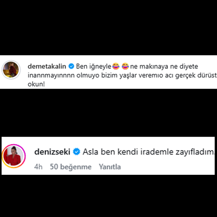 Deniz Seki, konuyla ilgili yaptığı açıklama "Asla, kendi irademle zayıfladım" derken Demet Akalın, "Ben iğneyle... Ne makinaya ne diyete inanmayın olmuyor, bizim yaşlar veremiyor. Acı gerçek dürüst olun" diyerek meslektaşlarına göndermede bulundu.