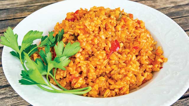 Sıvı yağı bir tencerede ısıtın, soğan ve biberleri ince ince doğrayıp kavurun ve salçayı ilave edin. Domatesleri ekleyin. Bulguru domatesli harca ilave edin. Tencereye bulgurun üzerini iki parmak geçecek kadar kaynar su ekleyip ocağı kısın. Tuzunu, karabiberini ve pul biberini ilave ettikten sonra bulgur tamamen suyunu çekene kadar pişirin. Ayrı bir tavada iki kaşık tereyağını iyice eritin. Tereyağını pişmiş bulgurun üzerine hemen sıcakken dökün. Pilavı 10 dakika dinlendirin.