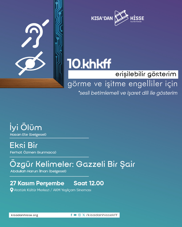 Kısa'dan Hisse Kısa Film Festivali'nde her yıl olduğu gibi bu yıl da işitme ve görme engelli bireyler için özel olarak hazırlanan gösterimler ayrıntılı altyazı ve sesli betimleme ile sunulacak. "Erişilebilir Gösterim" etkinliğinde, görme ve işitme engelliler için sesli betimlemeli ve işaret dili ile hazırlanan kısa filmlerin gösterimlerinin ardından filmlerin yönetmenleri ile de söyleşi düzenlenecek. Gösterim kapsamında; "İyi Ölüm", "Eksi Bir", "Özgür Kelimeler: Gazzeli Bir Şair" filmleri izleyiciyle buluşacak. Derneklerin ve federasyonların katılımıyla yapılacak "Erişilebilir Gösterim" etkinliği, 27 Kasım Perşembe günü saat 12.00'de AKM Yeşilçam Sineması'nda gerçekleşecek.