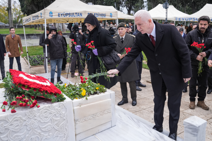 İstanbul Valiliğince, Mehmet Akif Ersoy'un Edirnekapı Şehitliği'ndeki kabri başında düzenlenen tören, saygı duruşu ve İstiklal Marşı'nın okunmasıyla başladı.