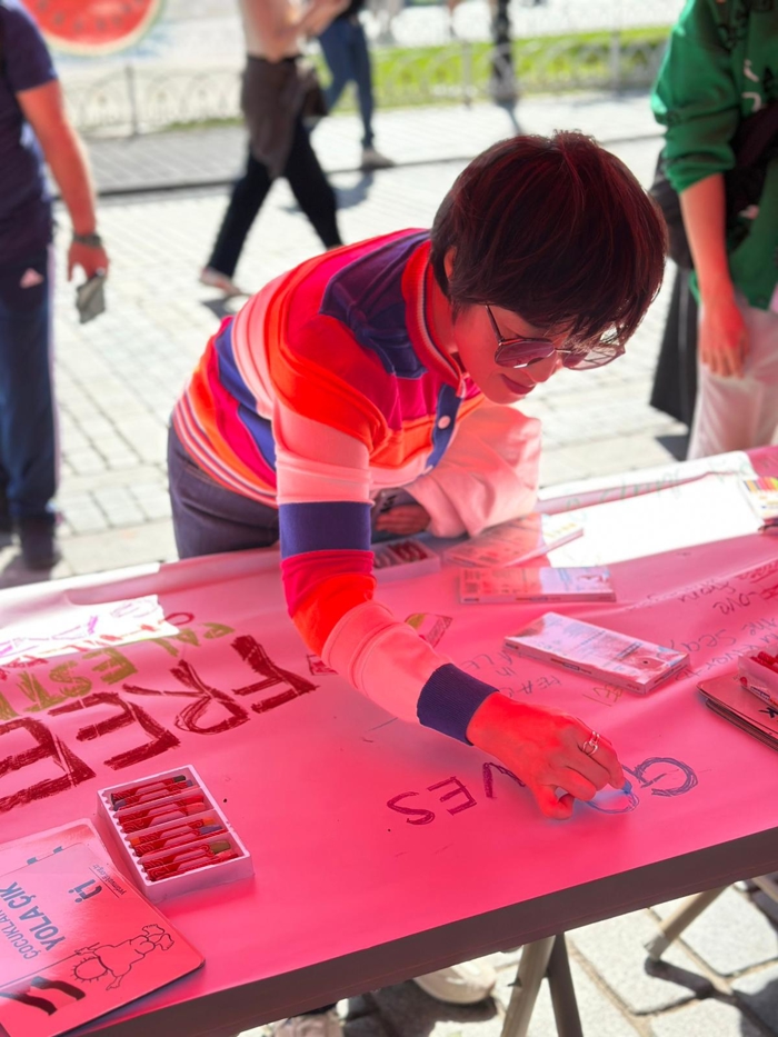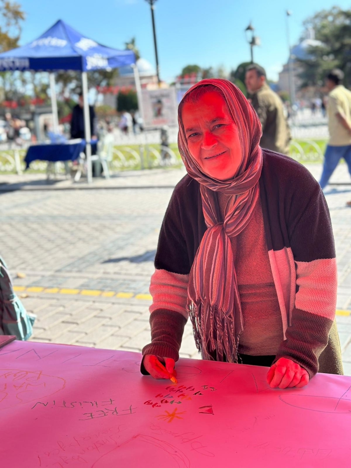 Kızı ile birlikte alana gelen ve tuvale Filistin bayrağı ve Sumud filoları çizen 70 yaşındaki Gülsüm Zengin "Filistin'e yardım ve destek için geldik. Katil İsrail'in işgalindeki Filistin halkına destek için, çocuklara destek ve umut olmak için resim çizmeye geldik. Burada olmaktan ötürü çok mutluyum" dedi.