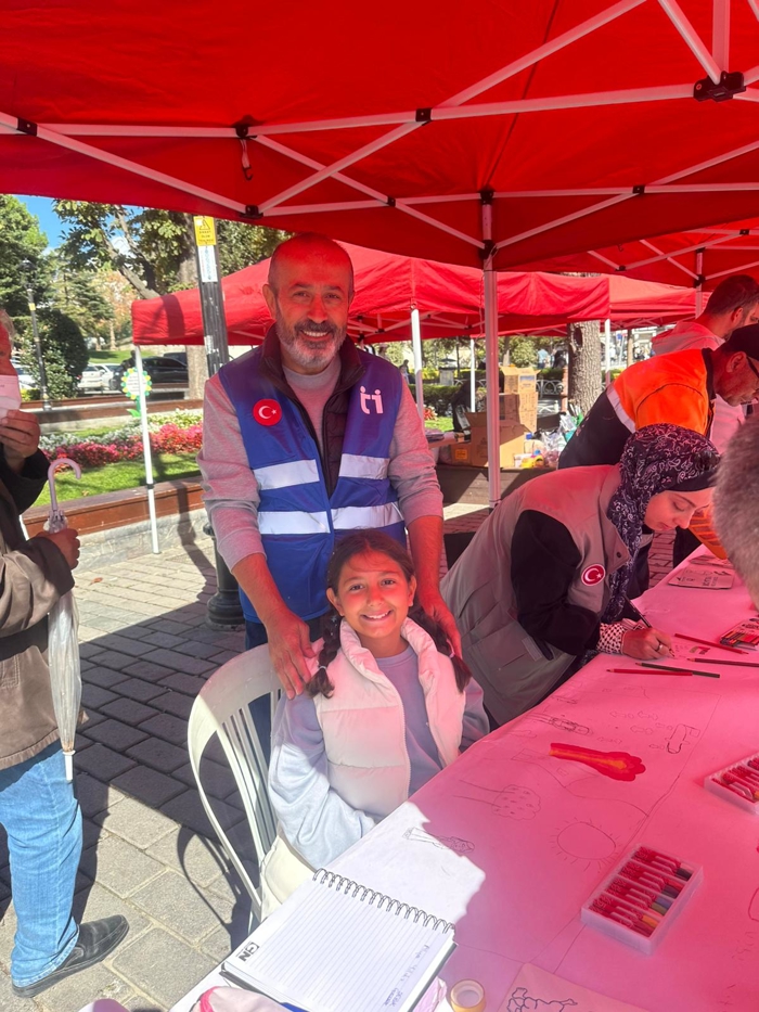 Yetim Vakfı Gönüllüsü Mustafa Susam torunu Alya Yıldız ile birlikte etkinlik alanındaydı. Susam "Yetim Vakfı ile bir yıldır acayip huzurlu bir şekilde yetimlere yardım etmiş olmanın verdiği mutlulukla yaşıyorum. Geçtiğimiz Kurban Bayramı'nda görevli olarak Afganistan'a gittim. 6 gün orada kaldım. Burada toplamış olduğumuz kurban bağışlarının yerinde kesimini uygun olup olmadığının kontrolleri için gittim. Bugün de torunumu getirdim buraya. Filistinli çocuklar için çiziyor. İnşallah dua ediyoruz en kısa zamanda özgürlüklerine kavuşacaklar. Kavuşmaları lazım. Üzülüyoruz. Elimizden ne geliyorsa onu yapmaya çalışıyoruz. Vicdanı olan hiç kimsenin boş durmaması lazım" dedi.