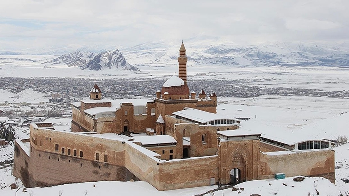 İshak Paşa Sarayı karlı manzarasıyla ziyaretçilerini ağırlıyor