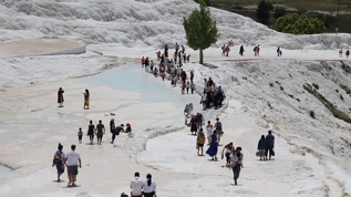 Denizli'de travertenleri, şifalı termal suyu ve çevresindeki antik kentlerle her mevsim turizmin çekim alanlarından olan Pamukkale'de, Kurban Bayramı tatili dolayısıyla ziyaretçi yoğunluğu yaşanıyor.