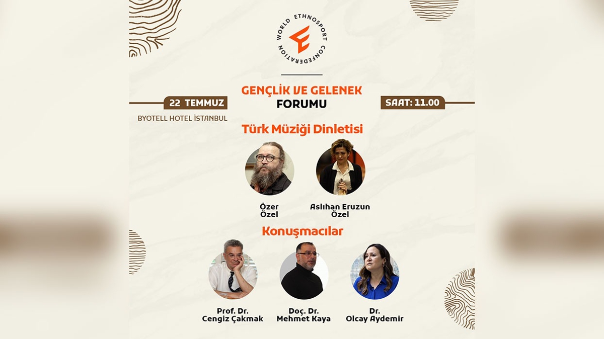 Dünya geleneklerinin ihyası alanında faaliyetlerini sürdüren Dünya Etnospor Konfederasyonu, geleneksel sporlar, oyunlar ve sanatları kapsayan araştırma projelerine Gençlik ve Gelenek Forumu ile devam ediyor. Açılış Paneli, Türk Müziği Dinletisi ve Odak Grup Toplantılarının yapılacağı ve iki gün sürecek olan forumda gençlerin gelenekle olan ilişkisi irdelenecek.
