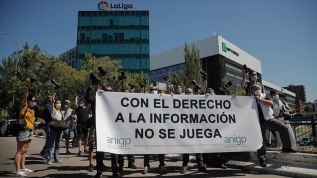 La Liga'nın Madrid'deki merkezi ile Valensiya, Barselona, Bilbao, Sevilla, Granada gibi ülkenin birçok kentindeki kulüp binaları önünde toplanan foto muhabirleri, "haber alma hakkıyla oynanamaz" yazılı pankart açtı.