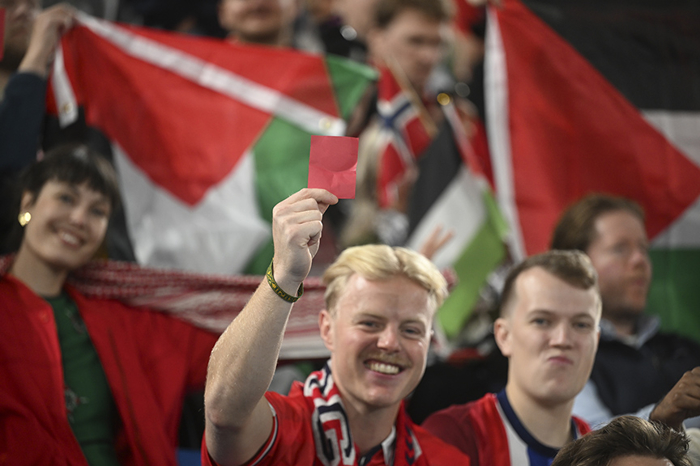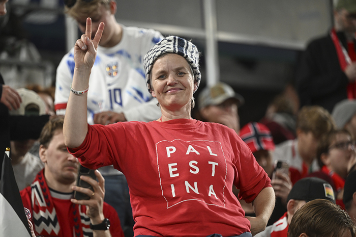 Norveçli taraftarlar, federasyonun izin vermesiyle stada Norveç ve Filistin bayraklarıyla gelerek desteklerini sürdürdü.