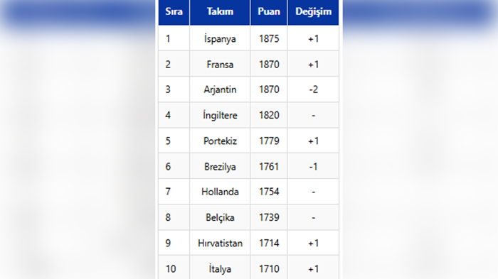 A Milli Takımın 2026 FIFA Dünya Kupası Elemeleri E Grubu'ndaki rakiplerinden İspanya 1875 puanla zirveye yerleşirken, Fransa 1870 puanla ikinci sıraya yükseldi. İlk sırada yer alan Arjantin ise üçüncü sıraya geriledi.